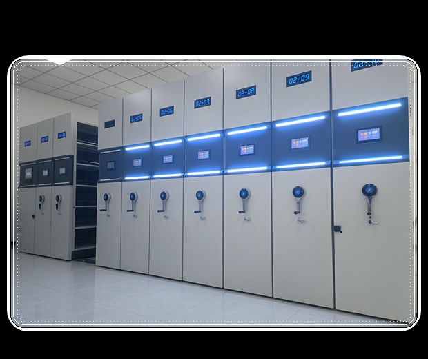 智能型檔案館密集柜是通過改造復柱式雙面固定柜,在其底座安裝軸輪,從而使之沿地面鋪設(shè)的小導軌直線移動,還可將多個柜子靠攏或分開,根據(jù)具體需要進行組裝組合,是一種可移動的密集型檔案裝具。